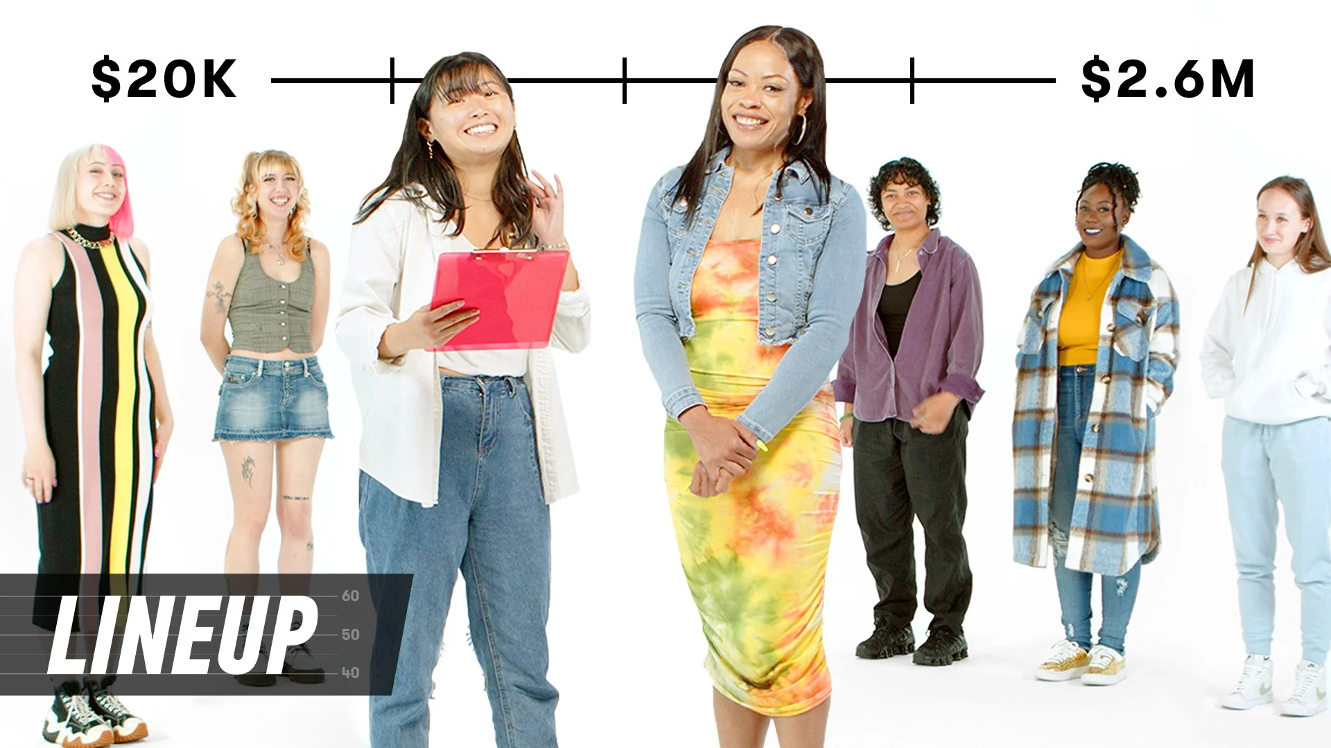 Lineup is a popular internet series on the YouTube channel known as Cut. The show focuses on exploring people's biases and having a conversation around them. Talent will try and match or guess specific traits about a group of anonymous people. I.e. Guess my Age, Match Person to Job, Guess my Phobia. By adding in visual effects to the series it can help the viewer visualize the full scope of the situation or simply enhance the entertainment value.